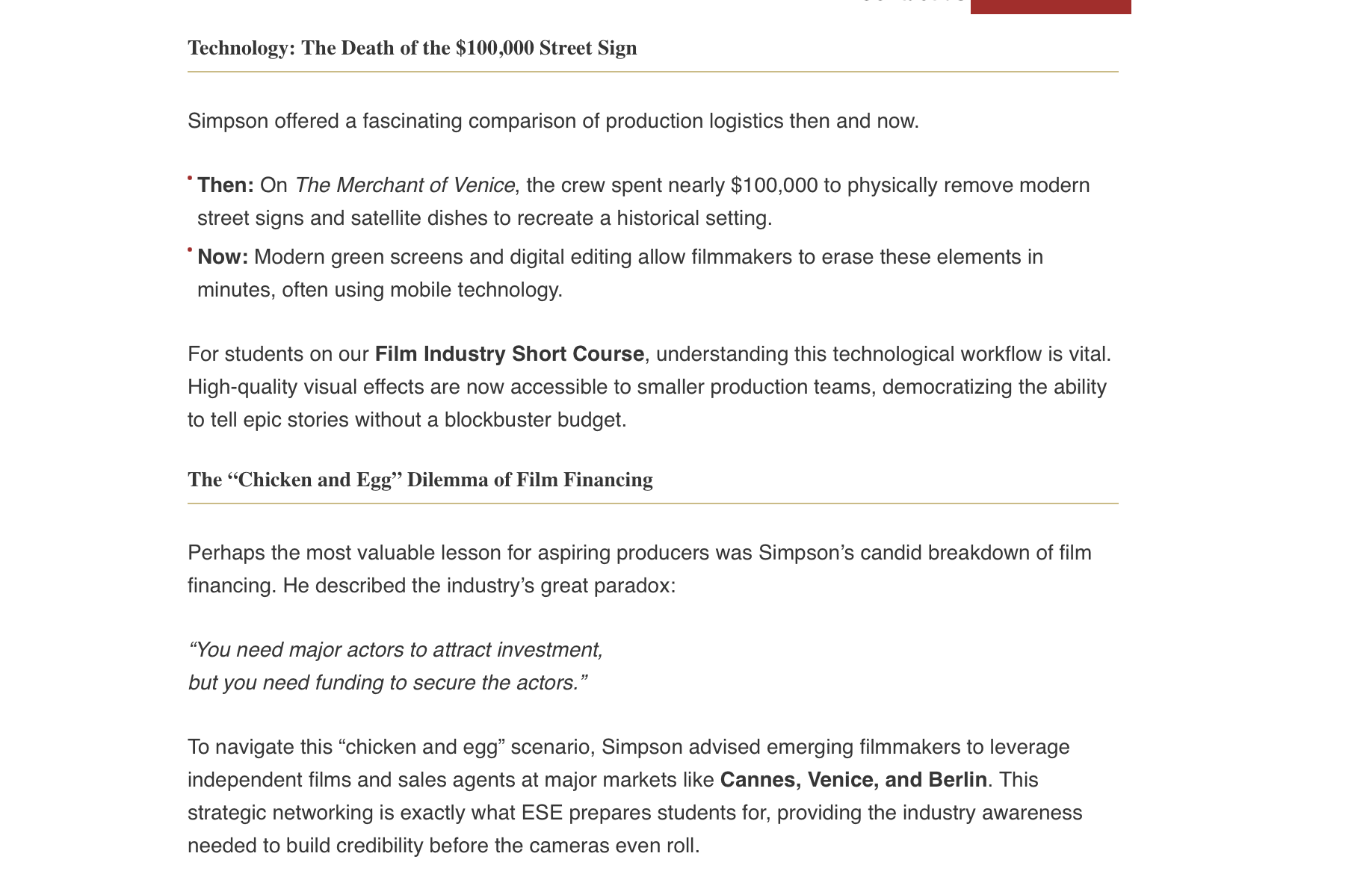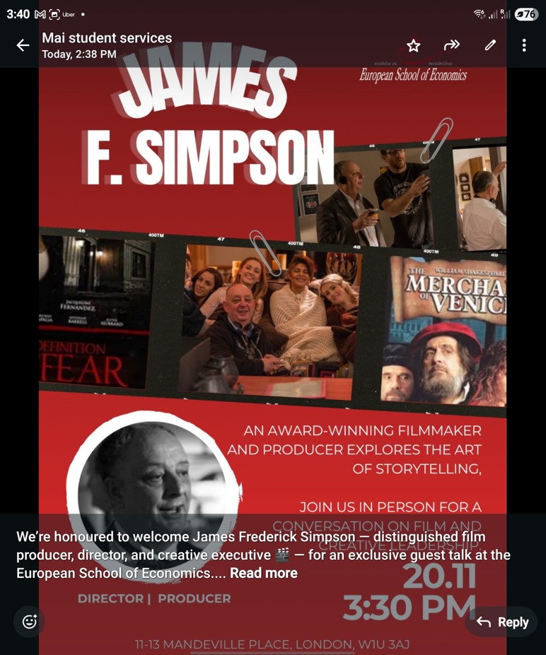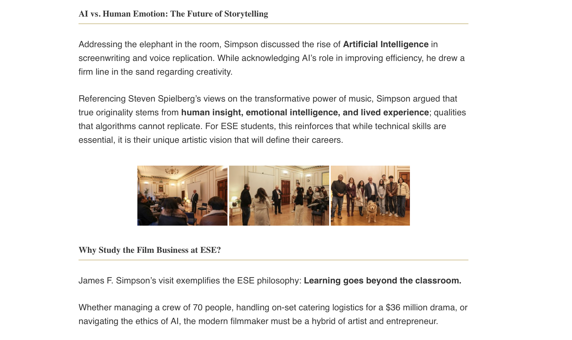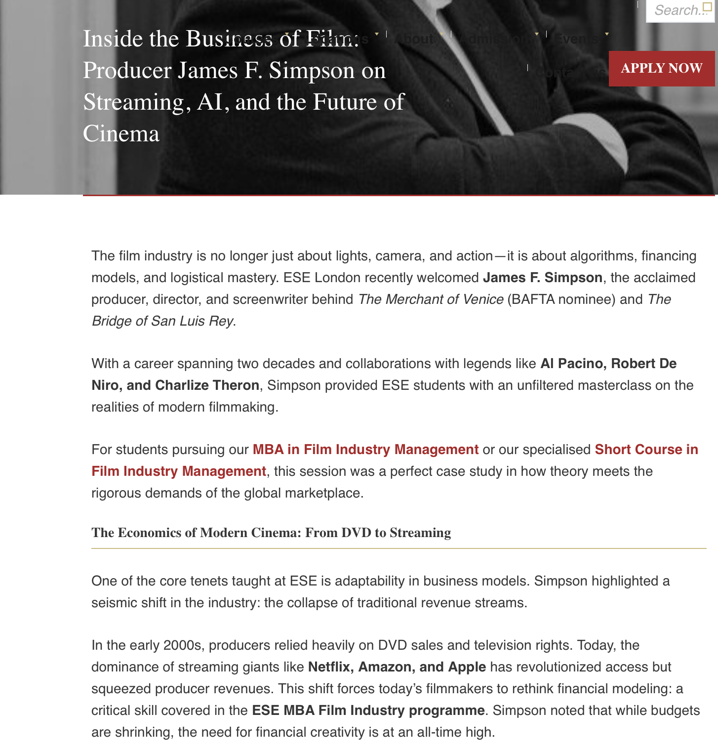 James lectured at the European School of Economics late 2025, on their MBA film degree in Film Industry Management.